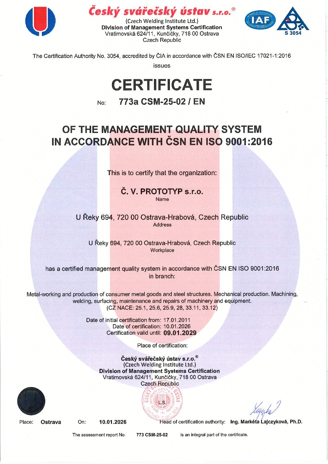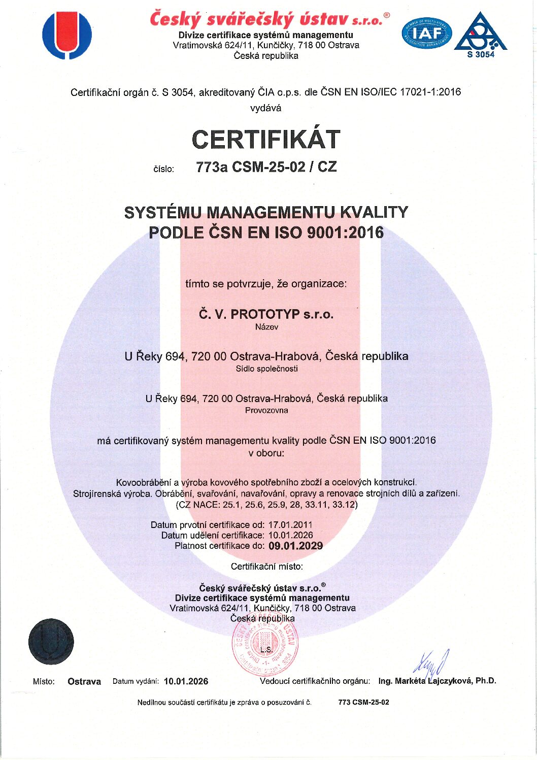 U všech strojů je pravidelně kontrolována jejich geometrie a přesnost. Používáme pouze měřidla, která jsou pravidelně kalibrovaná u akreditované metrologické společnosti. Všechny obrobky podléhají přísné výstupní kontrole. Kvalita jednotlivých dílů je deklarována rozměrovým protokolem všech rozměrů.